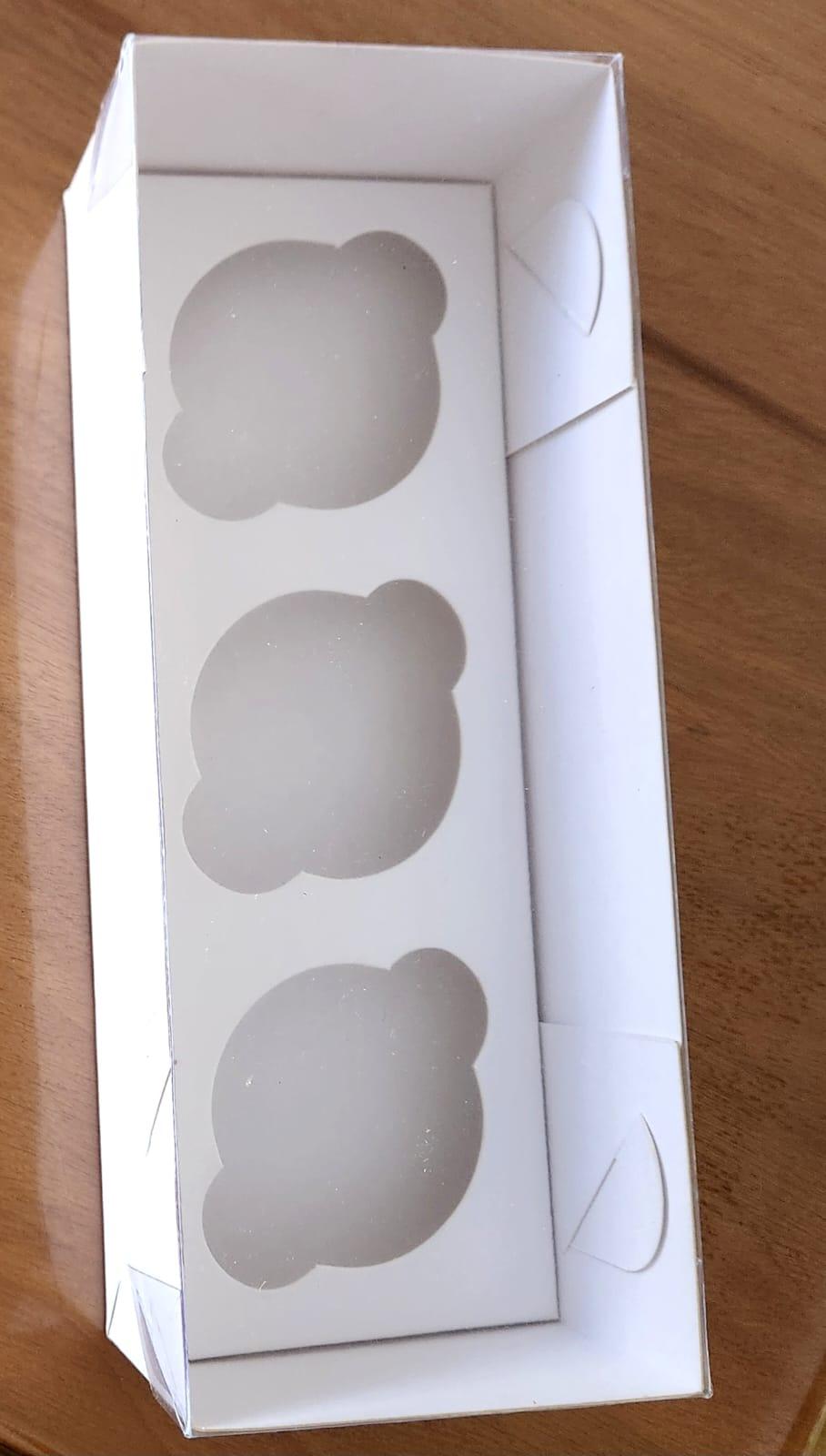 Caixa para 3 Cupcakes, 26 x 10 x 6,5 fundo branco com tampa acetato, com berço.