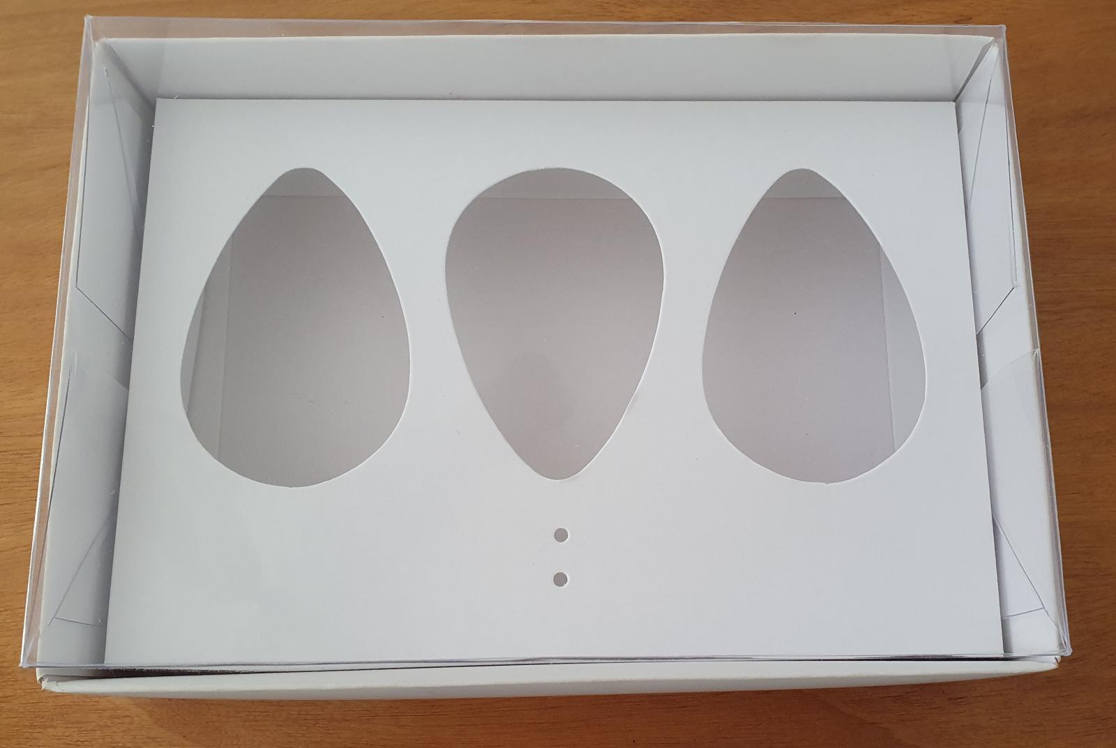 Caixa para Meio Ovo de Colher, Trio de 100 grs cada, Fundo Branco 21,5 x 15 x 5,5, Berço Branco e Tampa de acetato 6,5 cm de altura.